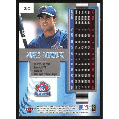 This is a 2001 Fleer Genuine Alex Gonzalez baseball card. The card is #30 and pictures show condition.