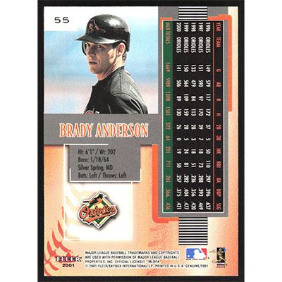 This is a 2001 Fleer Genuine Brady Anderson baseball card. The card is #55 and pictures show condition.