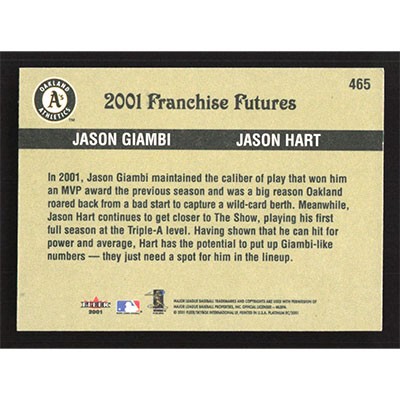 This is a 2001 Fleer Platinum Jason Giambi and Jason Hart Franchise Futures baseball card. The card is #465 and pictures show condition. Team(s): Oakland Athletics