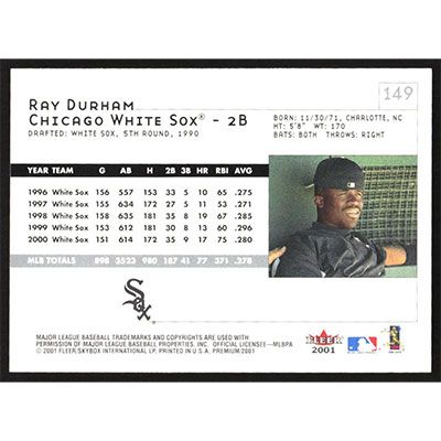 This is a 2001 Fleer Premium Ray Durham baseball card. The card is #149 and pictures show condition.
