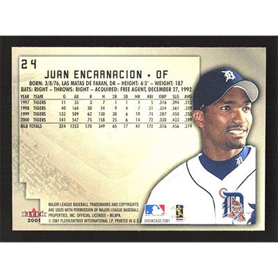 This is a 2001 Fleer Showcase Juan Encarnacion baseball card. The card is #24 and pictures show condition.