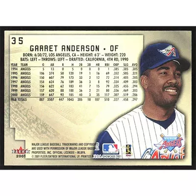 This is a 2001 Fleer Showcase Garret Anderson baseball card. The card is #35 and pictures show condition.