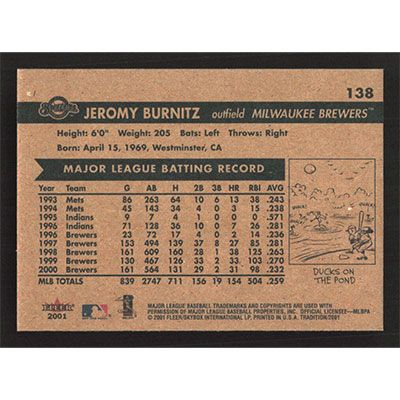 This is a 2001 Fleer Tradition Jeromy Burnitz baseball card. The card is #138 and pictures show condition.