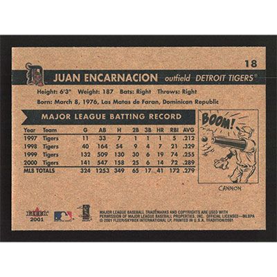 This is a 2001 Fleer Tradition Juan Encarnacion baseball card. The card is #18 and pictures show condition.