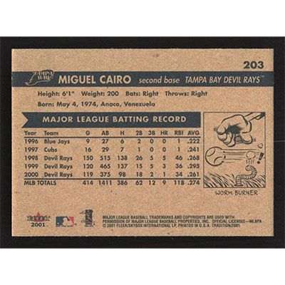 This is a 2001 Fleer Tradition Miguel Cairo baseball card. The card is #203 and pictures show condition.