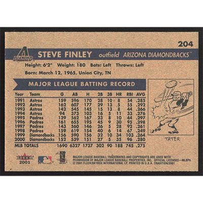 This is a 2001 Fleer Tradition Steve Finley baseball card. The card is #204 and pictures show condition.