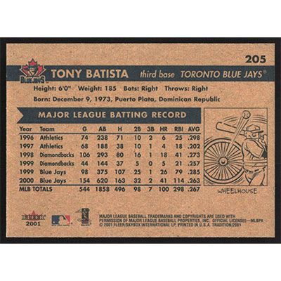 This is a 2001 Fleer Tradition Tony Batista baseball card. The card is #205 and pictures show condition.