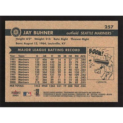 This is a 2001 Fleer Tradition Jay Buhner baseball card. The card is #257 and pictures show condition.