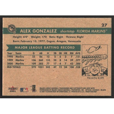 This is a 2001 Fleer Tradition Alex Gonzalez baseball card. The card is #27 and pictures show condition.