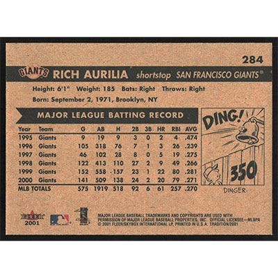 This is a 2001 Fleer Tradition Rich Aurilia baseball card. The card is #284 and pictures show condition.