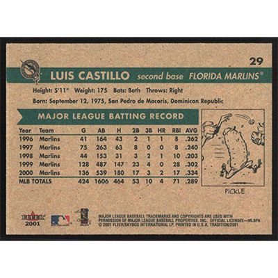 This is a 2001 Fleer Tradition Luis Castillo baseball card. The card is #29 and pictures show condition.