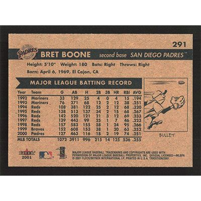 This is a 2001 Fleer Tradition Bret Boone baseball card. The card is #291 and pictures show condition.