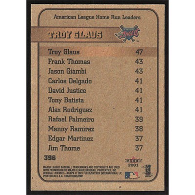This is a 2001 Fleer Tradition Troy Glaus League Leaders baseball card. The card is #396 and pictures show condition.