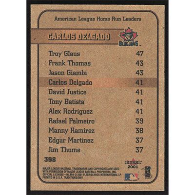 This is a 2001 Fleer Tradition Carlos Delgado League Leaders baseball card. The card is #398 and pictures show condition.