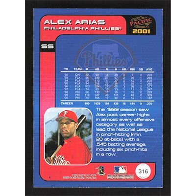 This is a 2001 Pacific Alex Arias baseball card. The card is #316 and pictures show condition.