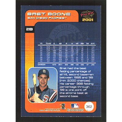This is a 2001 Pacific Bret Boone baseball card. The card is #362 and pictures show condition.