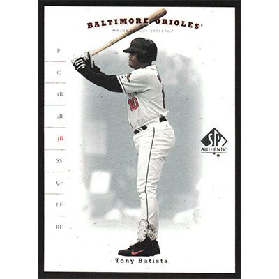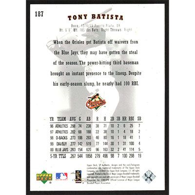 This is a 2001 SP Authentic Tony Batista baseball card. The card is #187 and pictures show condition.