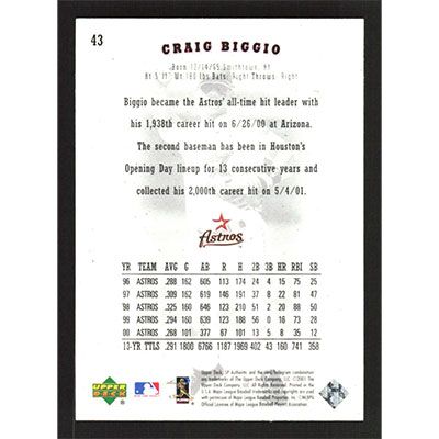 This is a 2001 SP Authentic Craig Biggio baseball card. The card is #43 and pictures show condition.