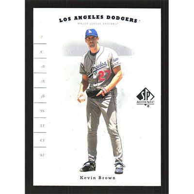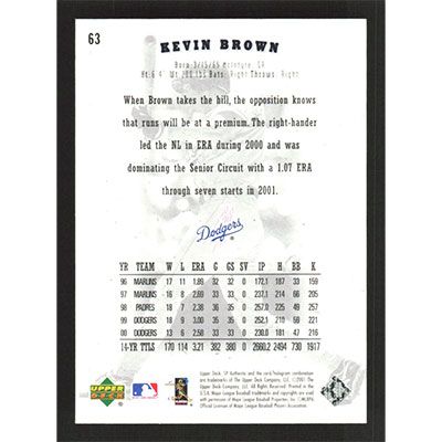 This is a 2001 SP Authentic Kevin Brown baseball card. The card is #63 and pictures show condition.