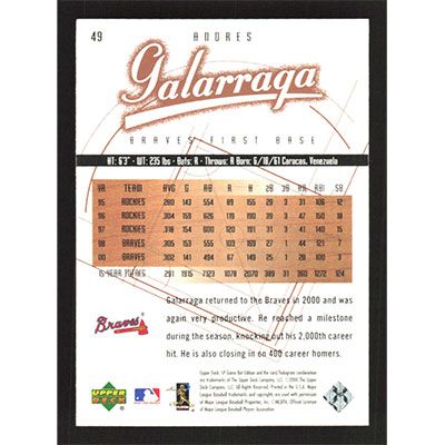 This is a 2001 SP Game Bat Edition Andres Galarraga baseball card. The card is #49 and pictures show condition.
