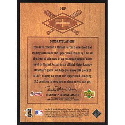 This is a 2001 SP Game Bat Milestone Piece of Action International Rafael Furcal Bat baseball card. The card is #I-RF and pictures show condition. Team(s): Atlanta Braves