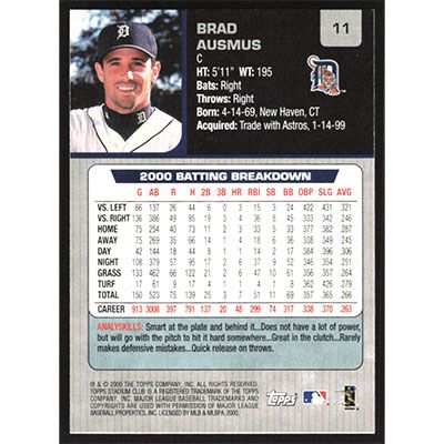 This is a 2001 Stadium Club Brad Ausmus baseball card. The card is #11 and pictures show condition.