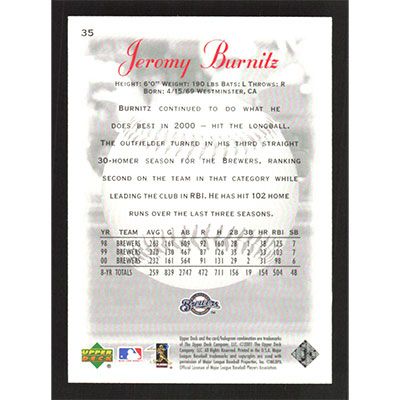 This is a 2001 Sweet Spot Jeromy Burnitz baseball card. The card is #35 and pictures show condition.