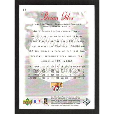 This is a 2001 Sweet Spot Brian Giles baseball card. The card is #56 and pictures show condition.