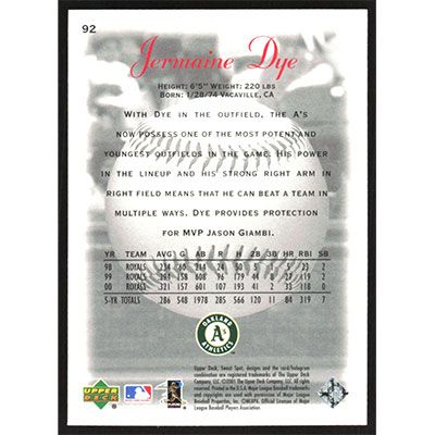 This is a 2001 Sweet Spot Jermaine Dye baseball card. The card is #92 and pictures show condition.