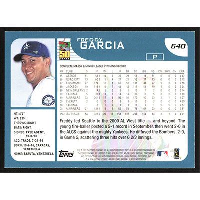 This is a 2001 Topps Freddy Garcia autographed baseball card. This card has been signed, in blue, by Freddy Garcia, and is guaranteed authentic by Ballcardz.com. The card is #640 and pictures show condition.