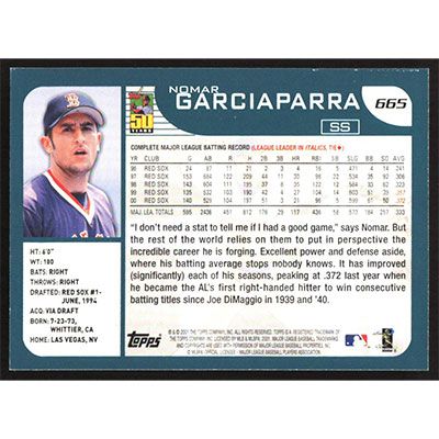 This is a 2001 Topps Nomar Garciaparra baseball card. The card is #665 and pictures show condition.