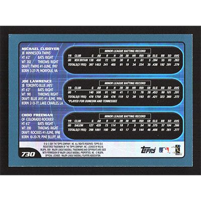 This is a 2001 Topps Michael Cuddyer, Joe Lawrence and Choo Freeman Prospects baseball card. The card is #730 and pictures show condition. Team(s): Minnesota Twins/Toronto Blue Jays/Colorado Rockies