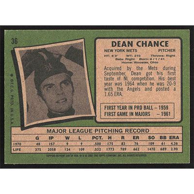 This is a 2001 Topps Archives Dean Chance 1971 baseball card. The card is #349 and pictures show condition.