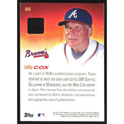 This is a 2001 Topps Base Hit Autograph Relics Bobby Cox Base autographed baseball card. This card has been signed, in blue, by Bobby Cox, and is certified authentic by Topps. The card is #BH5 and pictures show condition. This card is exceedingly rare. No print run was ever disclosed, but it is thought to be less to 25 copies. Also, this is the ONLY pack issued on-card autograph of Bobby Cox in a Braves uniform outside of a product like Archives.