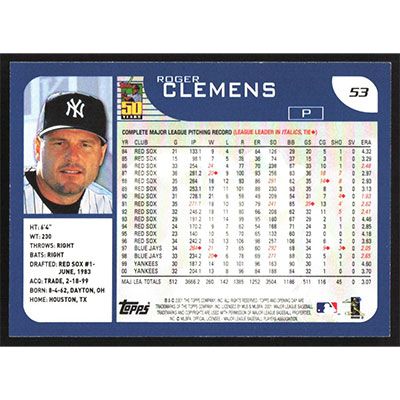 This is a 2001 Topps Opening Day Roger Clemens baseball card. The card is #53 and pictures show condition.