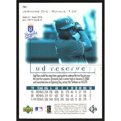 This is a 2001 UD Reserve Jermaine Dye baseball card. The card is #58 and pictures show condition.