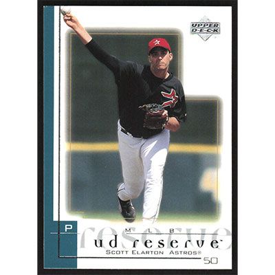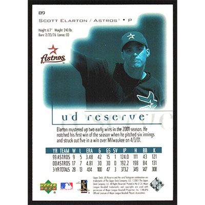 This is a 2001 UD Reserve Scott Elarton baseball card. The card is #89 and pictures show condition.