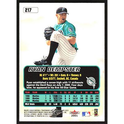 This is a 2001 Ultra Ryan Dempster baseball card. The card is #217 and pictures show condition.