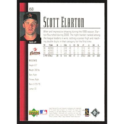 This is a 2001 Upper Deck Scott Elarton baseball card. The card is #153 and pictures show condition.