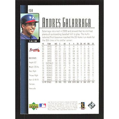 This is a 2001 Upper Deck Andres Galarraga autographed baseball card. This card has been signed, in blue, by Andres Galarraga, and is guaranteed authentic by Ballcardz.com. The card is #158 and pictures show condition.
