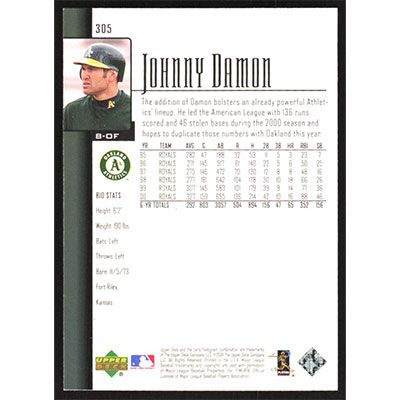 This is a 2001 Upper Deck Johnny Damon baseball card. The card is #305 and pictures show condition.