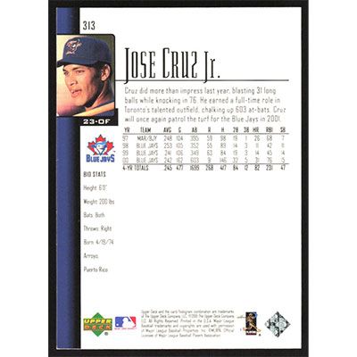 This is a 2001 Upper Deck Jose Cruz Jr. baseball card. The card is #313 and pictures show condition.