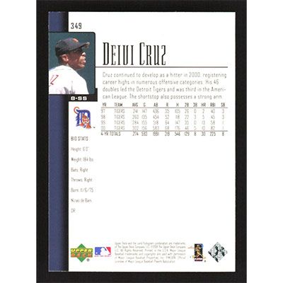 This is a 2001 Upper Deck Deivi Cruz baseball card. The card is #349 and pictures show condition.