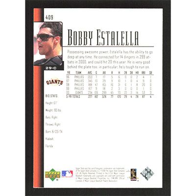 This is a 2001 Upper Deck Bobby Estalella baseball card. The card is #409 and pictures show condition.