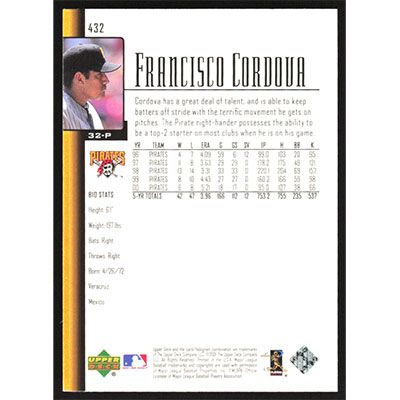 This is a 2001 Upper Deck Francisco Cordova baseball card. The card is #432 and pictures show condition.