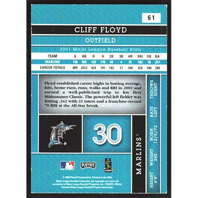 This is a 2002 Absolute Memorabilia Cliff Floyd baseball card. The card is #61 and pictures show condition.