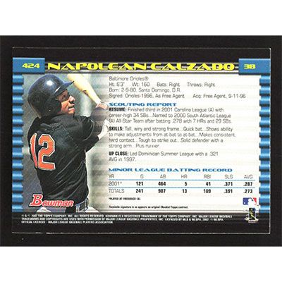 This is a 2002 Bowman Napoleon Calzado baseball card. The card is #424 and pictures show condition.