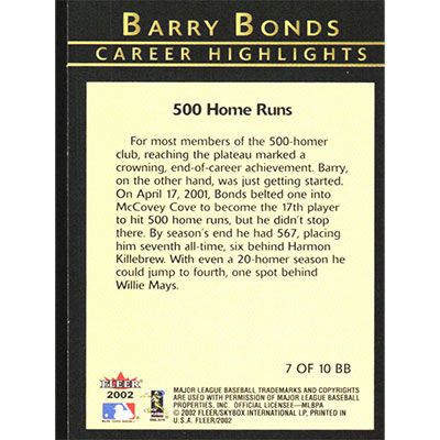 This is a 2002 Fleer Barry Bonds Career Highlights 500 Home Runs baseball card. The card is #7 and pictures show condition. Team(s): San Francisco Giants