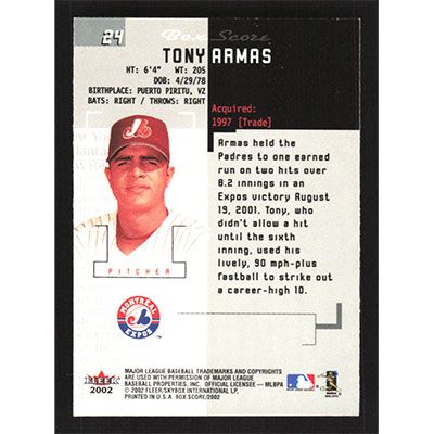 This is a 2002 Fleer Box Score Tony Armas baseball card. The card is #24 and pictures show condition.