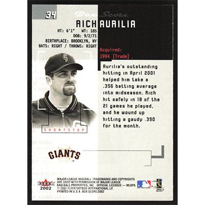 This is a 2002 Fleer Box Score Rich Aurilia baseball card. The card is #34 and pictures show condition.